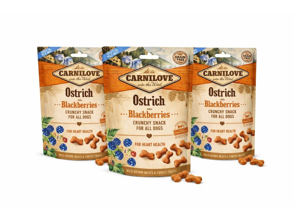Doplňkové krmivo Carnilove Crunchy si zamiluje každé psisko. Bezobilné pamlsky pro psy Carnilove jsou vyrobeny z čerstvého masa, které je vhodně doplněno o zdravé ingredience. V případě receptury "Ostrich & Blackberries" se mimo jiné jedná o žlutý hrách, ovoce, zeleninu, lněný olej a lněná semínka. Tato receptura je vhodná pro malá plemena (drobné kousky).