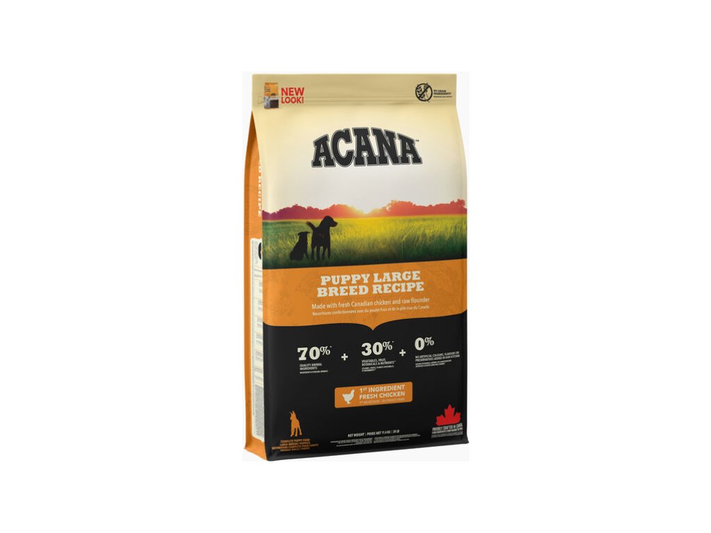 Acana Puppy Large Breed je kompletní krmivo pro štěňata velkých plemen, které budou v dospělosti vážit více než 25 kg. Štěně velkého plemene má unikátní nutriční potřeby pro udržení svalové hmoty, to zahrnuje mnoho bílkovin z kvalitních živočišných surovin a základních minerálních látek. ACANA Puppy Large Breed je proto plná čertsvého kuřecího masa a volně žijících platýsů, k tomu všemu jsme ještě přidali výživné vejce od volně chovaných slepic, která poskytnou vašemu rostoucímu štěněti vše, co zrovna pro své zdraví potřebuje. Acana zaručuje, že udrží vaše štěně spokojené, zdravé a silné.