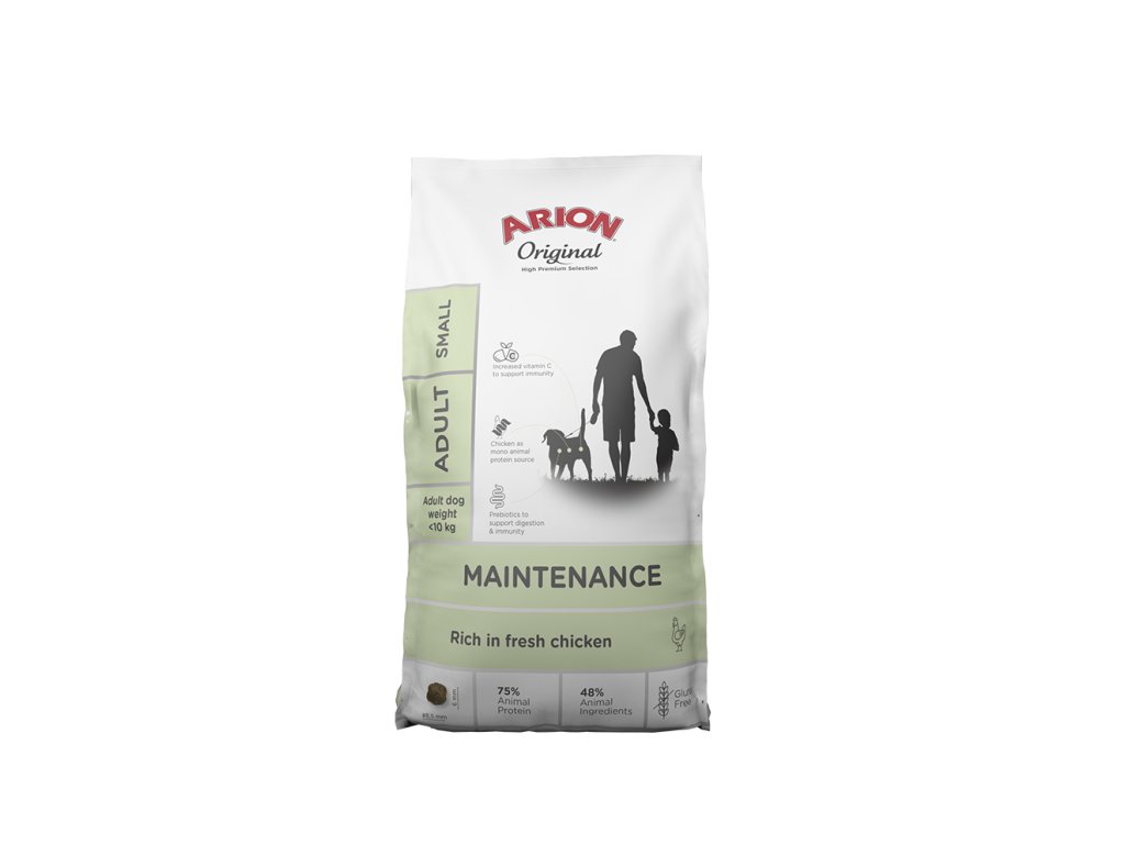 Arion Original Maintenance je kompletní krmivo pro dospělé psy středních plemen. Bezlepková receptura na bázi kuřecího obsahuje prebiotika, antioxidanty a vyšší hladinu vitaminu C pro podporu imunity.