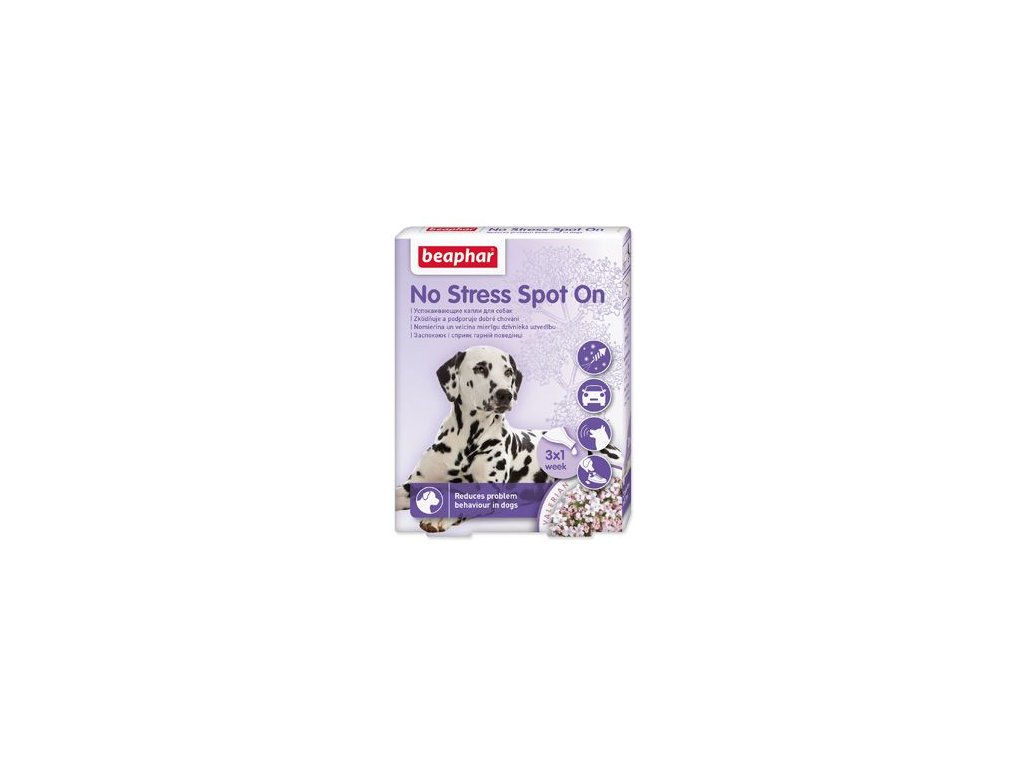 Beaphar No Stress Spot On je vhodný pro všechna plemena a věkové kategorie psů. Snižuje stres u psů a udržuje je v klidu díky zklidňujícímu účinku extraktu kozlíku lékařského, který je obsažen v mikrokapslích. Ty fungují na principu pomalého uvolňování a dlouhodobého účinku.Používá se v případě nadměrného štěkání nebo kňučení v důsledku úzkosti z odloučení, návštěvy veterináře, při cestování, bouřce nebo ohňostroji či v případě destruktivního nebo nežádoucího územního chování.