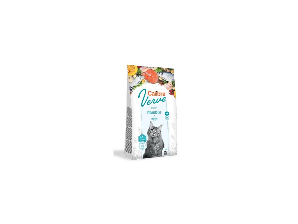 Calibra Cat Verve Sterilised Herring je kompletní krmivo bez obilovin s vysokým obsahem čerstvého rybího masa. Receptura je určená pro sterilizované a kastrované kočky.