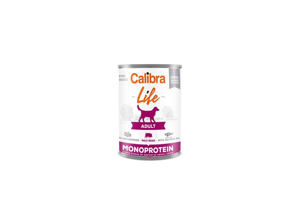 Calibra Dog Life Adult Wild Boar with Cranberries - receptura konzervy s kančím a brusinkami je kompletním krmivem, které je určené pro dospělé psy.Receptura je založena na jediném druhu proteinu, je sestavena z omezeného počtu ingrediencí. Složení konzervy je bez obilovin, bez lepku, obsahuje jen suroviny té nejvyšší kvality, které jsou ze 100% definovaných zdrojů, což má vliv na lehkou stravitelnost krmiva.