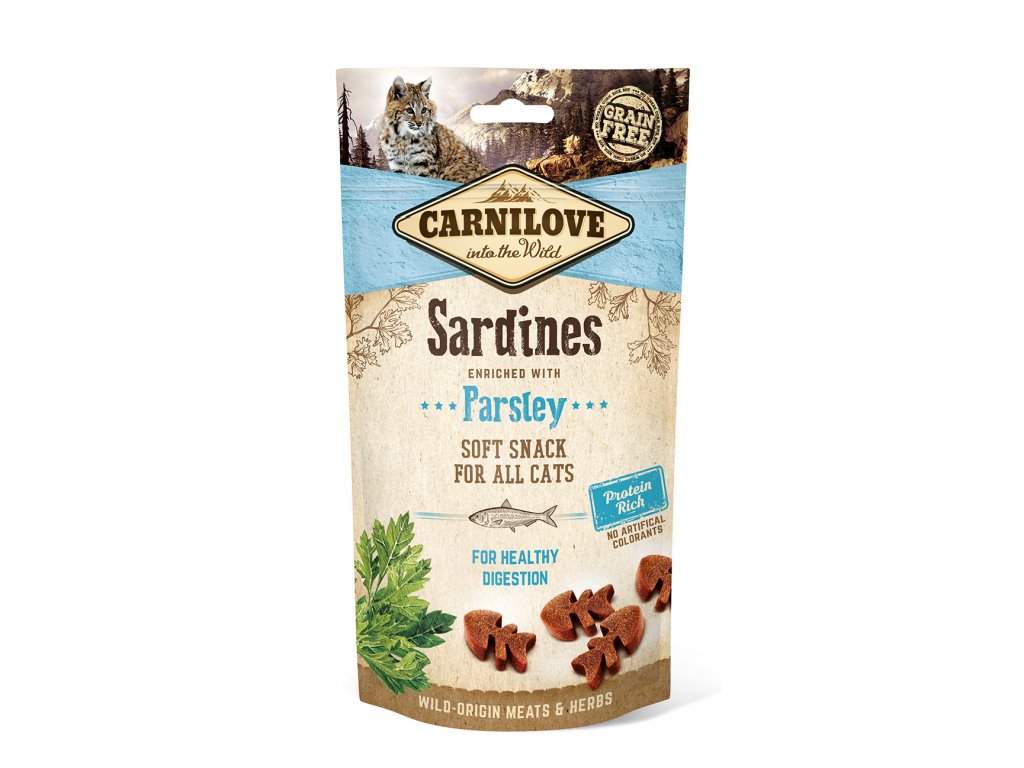 Poloměkké a křupavé pamlsky pro kočky Carnilove Snack s masem ze sardinek. Lahodné pamlsky Sardines with Parsley (sardinky s petrželí) jsou vhodné pro všechny kočky. Ve složení nejsou obsaženy žádné obiloviny a ani umělá barviva. Petržel podporuje zdravé trávení.