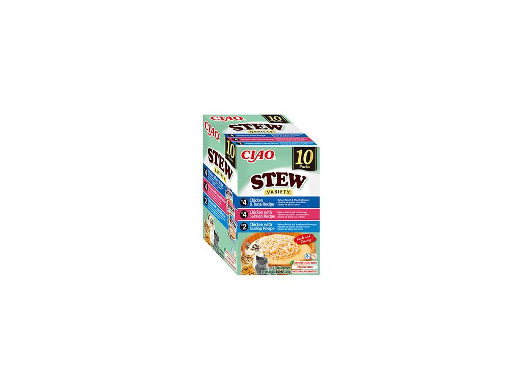 Ciao STEW Multipack obsahuje 10 kapsiček trhaného kuřecího masa v lahodném krémovém vývaru v různých variantách. Pečlivě vybrané suroviny a přísně kontrolovaná čerstvost. Vaše kočka si bude užívat lákavou vůni a neodolatelnou chuť při každém otevření kapsičky! Vyrobeno ze 100% čistého kuřecího prsa a mořského tuňáka. Žádné obiloviny, konzervanty ani umělé barviva. Vysoký obsah vody, který je prospěšný pro celkové zdraví koček. Nízký obsah kalorií.