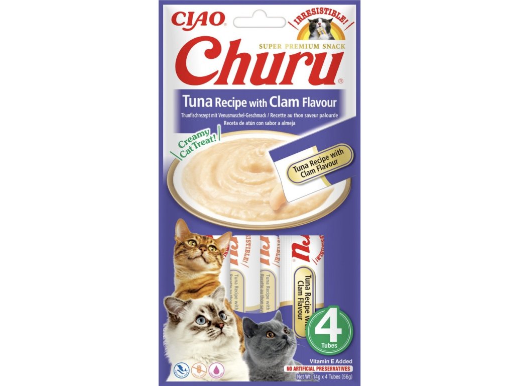 Churu masové pyré pro kočky s tuňákem a s příchutí škeble. Lahodný, přírodní pamlsek krémové konzistence bez obilovin. Zdravé mlsání s nízkým obsahem kalorií, bez konzervantů, chemických aromat, bez barviv a umělých dochucovadel. Masové pyré můžete také podávat stejně jako jinou kočičí kapsičku přímo z misky nebo ho můžete přidat ke granulím pro vylepšení jejich chuti.Kočičí pamlsky Churu mají vysoký obsah vody a díky tomu jsou vhodným doplňkem k suchému krmivu nebo pro kočky, které málo pijí. Churu jsou 100% přírodní a zdravé mlsání pro kočky všech věkových kategorií. Churu jsou ideální pro ukrytí tablety na odčervení či jiného léku, který je potřeba kočce nenásilně podat.