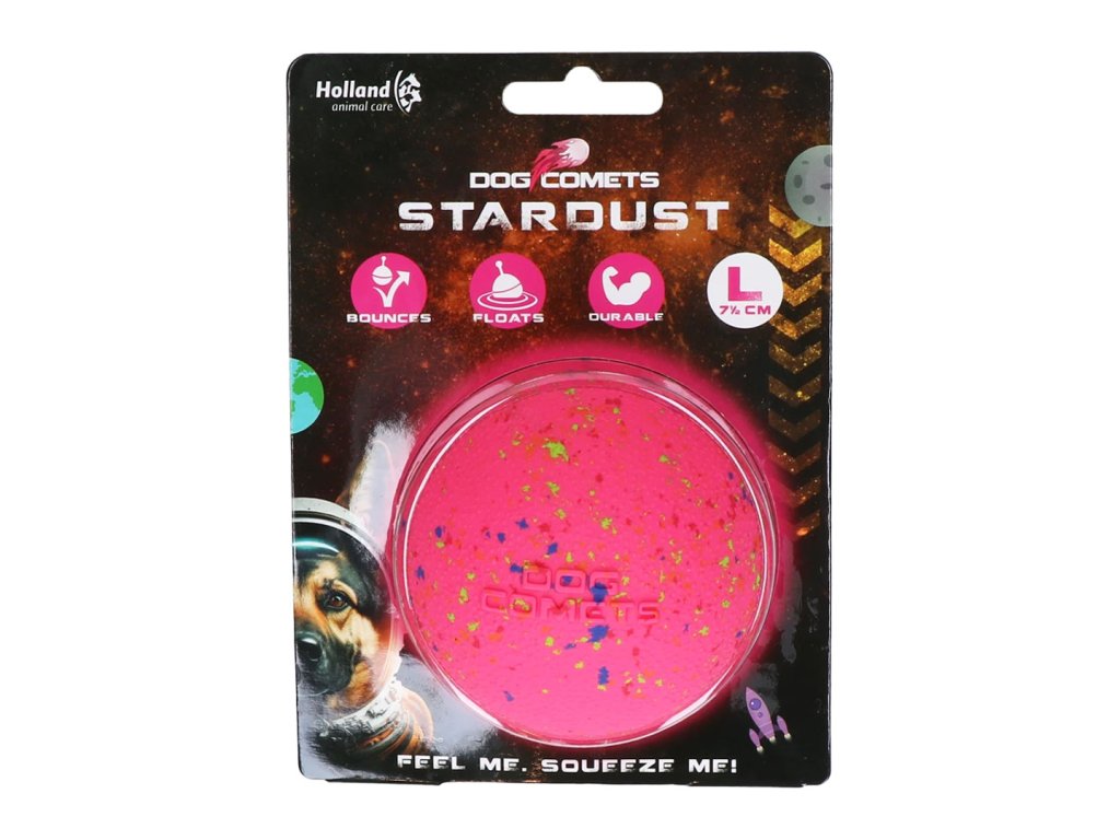 Stardust míček je vyroben z přírodního kaučuku, který dokonale skáče a je velmi odolný. Pejsci jsou nadšeni, jak pohodlně se žvýká a majitelé zase tím, že vydrží, při žvýkání masíruje dásně a udržuje psí zoubky čisté. Míček lze po hraní snadno opláchnout, protože je voděodolný.