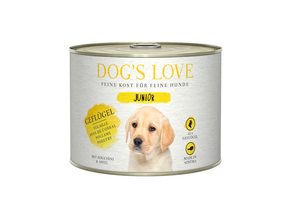 DOG'S LOVE konzerva JUNIOR Classic DRŮBEŽÍ s cuketou a jablky je přírodní kompletní krmivo pro štěňata a rostoucí psy všech plemen ve 100% human grade kvalitě, což znamená, že splňuje podmínky pro lidskou spotřebu, a to jak po stránce použitých surovin, tak i způsobem výroby.
