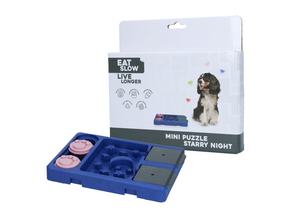 Krásný modrý hlavolam pro pokročilejší luštitele nabídne hned tři různé výzvy! Středová část funguje jako zpomalovací miska s výstupky ve tvaru měsíce a hvězd. Na jedné straně čekají růžová kolečka s tlapkami. Pejsek je může posouvat, ale ne vyndat, a musí přijít na to, jak posunutím odhalit ukryté dobroty. Druhá strana skrývá šedé zavírací přihrádky, které pejsek musí otevřít, aby se dostal k pamlskům. Díky malým dírkám ve víčkách může cítit vůni dobrot nebo mu úkol trochu ulehčíte, když skrz dírku protáhnete provázek s uzlíkem. Skvělá zábava, která potrápí psí hlavičku i tlapky!