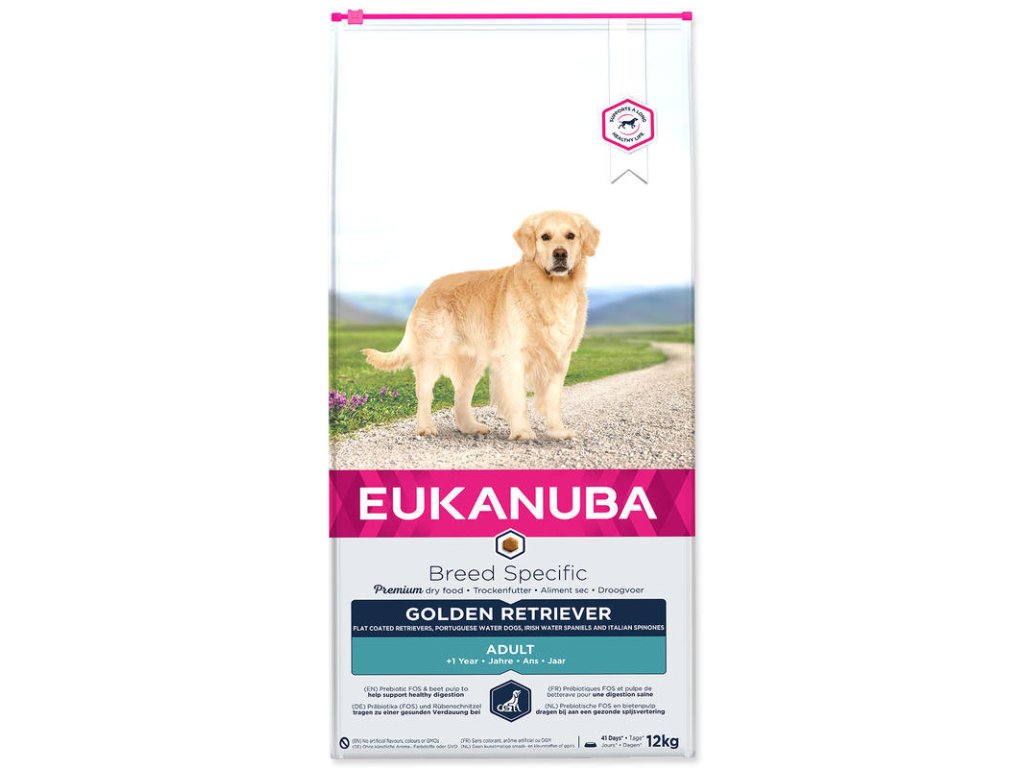 Krmivo Eukanuba Adult Breed Specific Golden Retriever splňuje specifické nutriční požadavky velkých a silných plemen jako je zlatý retrívr, hladkosrstý retrívr (flat coated), irský vodní španěl , portugalský vodní pes nebo italský ohař. Obsahuje o 13 % více bílkovin než běžná krmiva a přispívá tak k rozvoji a udržení silného svalstva. L-karnitin povzbuzuje látkovou výměnu a napomáhá redukovat množství tuku v těle. Speciální receptura s přídavkem prebiotik a řepných řízků podporuje činnost střev a optimalizuje vstřebávání živin.