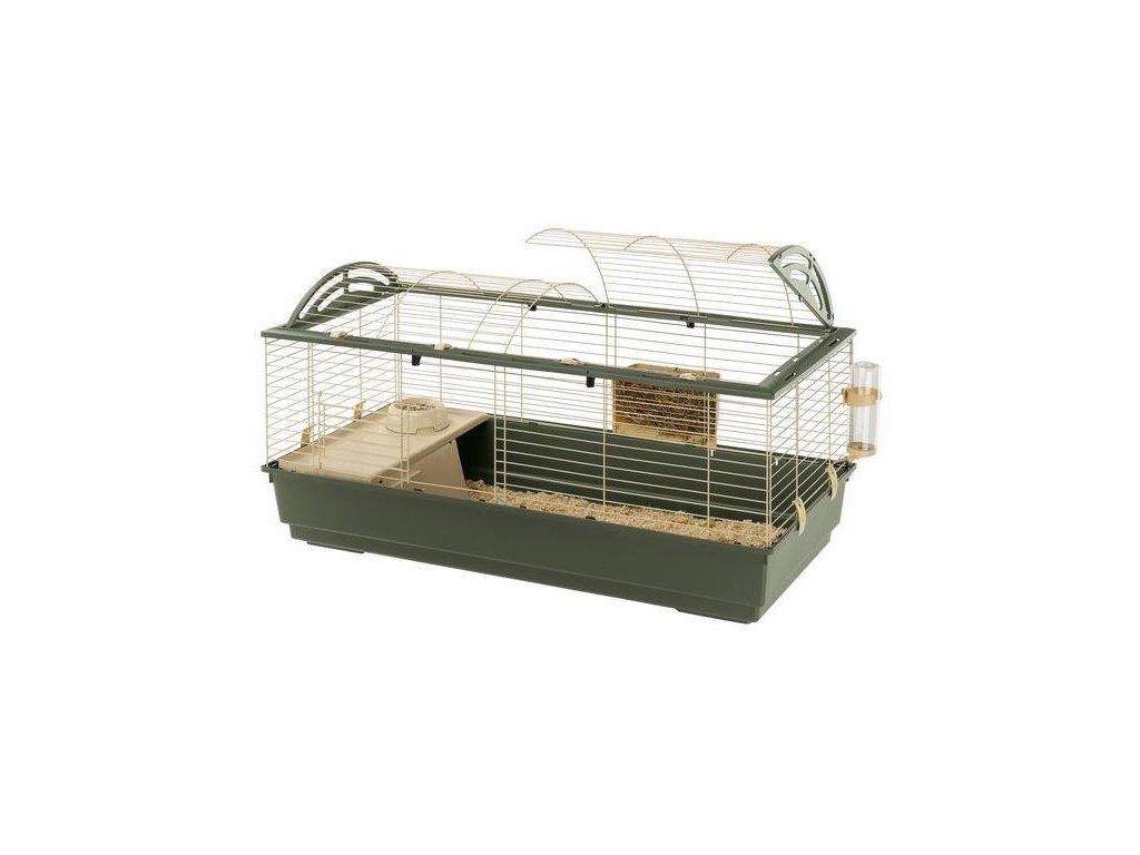 Je vybavena plastovým domečkem, napaječkou, miskou na krmení a jeslemi na seno.