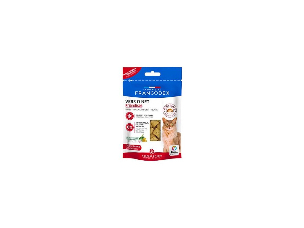 Pamlsky pro pohodlí střev Francodex jsou vyrobeny z kombinace rostlin a obsahují česnek, tymián, vratič a pískavice řecké seno. Bez umělých barviv a konzervantů a bez přidaného cukru přispívají ke střevní pohodě vaší kočky a pomáhají jí vyrovnat se s různými stresory, které narušují trávicí rovnováhu.