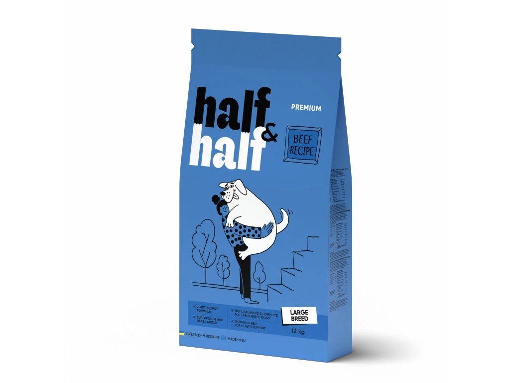 Kompletní suché krmivo, které psovi poskytne potřebné živiny pro zdravý a aktivní život. Receptura Half&Half je obohacená o ovoce, zeleninu, chondroprotektiva a léčivé rostliny, díky čemuž vašemu mazlíčkovi zajišťuje optimální výživu a chuť v každé porci. Výživné hovězí maso je kompletní bílkovinou ideální k udržení zdravé kondice a optimální hmotnosti vašeho domácího mazlíčka. Otruby zlepšují trávení, střevní peristaltiku a pomáhají vylučovat toxiny z těla. Řepa a brokolice pomáhají zlepšovat a optimalizovat trávicí procesy a udržovat zdraví střev. Glukosamin a chondroitin sulfát pomáhají posilovat a podporovat zdraví kloubů, chrupavek a pohyblivost. Směs léčivých rostlin se stará o silnou imunitu zvířete. Určené pro dospělé psy velkých plemen od 25 kg.