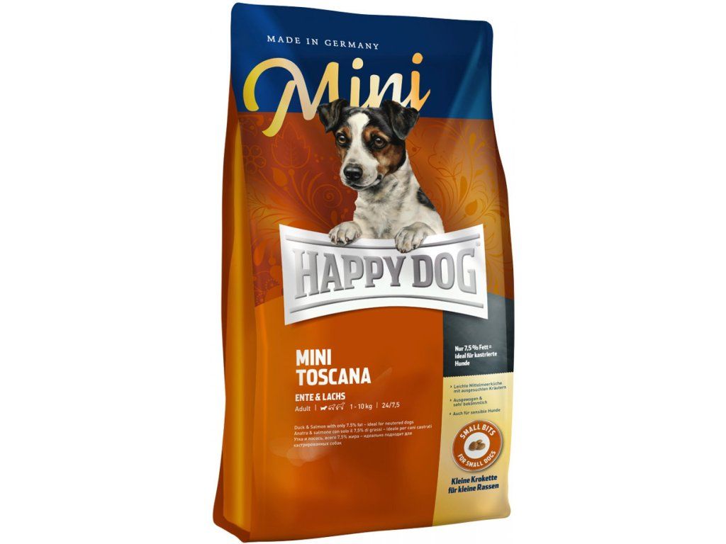 Kompletní hypoalergenní superprémiové granule Happy Dog Mini Toscana mají recepturu pro dospělé, či starší psy malých plemen a pejsky s nízkou potřebou energie. Granule Happy Dog Mini Toscana obsahují bezlepkovou receptůru pro velmi citlivé pejsky a mlsné jazýčky. Granule jsou určené také pejskům s nadváhou. Granule pro psy Happy Dog Mini Toscana obsahují výběrové maso z lososa a kachnu. Jsou kompletně bezlepkové. Granule Happy Dog Mini Toscana vlastnosti 24% proteinů / 7,5% tuků Ideální také pro kastrované pejsky Výběrové proteiny - losos a kachna Bezlepkové přísady Obsahuje kloubní výživu Dávkování krmiva Happy Dog Mini Toscana Hmotnost psa je uvedena v kilogramech. Denní krmná dávka granulí Happy Dog Mini Toscana je uvedena v gramech a udává celkové množství krmiva pro celý den. Dle potřeby ji můžete rozdělit na vícero dílčích dávek (porcí). Při podávání pamlsků (odměn), je potřeba denní krmou dávku granulí Happy Dog Mini Toscana adekvátně snížit. Krmivo Happy Dog Mini Toscana podávejte suché, nebo ho zalijte cca 60 °C teplou vodou a nechte krátce nabobtnat. Pro zpestření, či vyšším zatížení psa je možné přimíchat do granulí kvalitní konzervu s masem. Vždy zajistěte stálý přístup k čerstvé pitné vodě. Hmotnost psa Denní dávka (do 3 hodin pohybu/den) 1 kg 25 g 2 kg 45 g 3 kg 60 g 4 kg 75 g 5 kg 90 g 6 kg 100 g 8 kg 125 g 10 kg 150 g