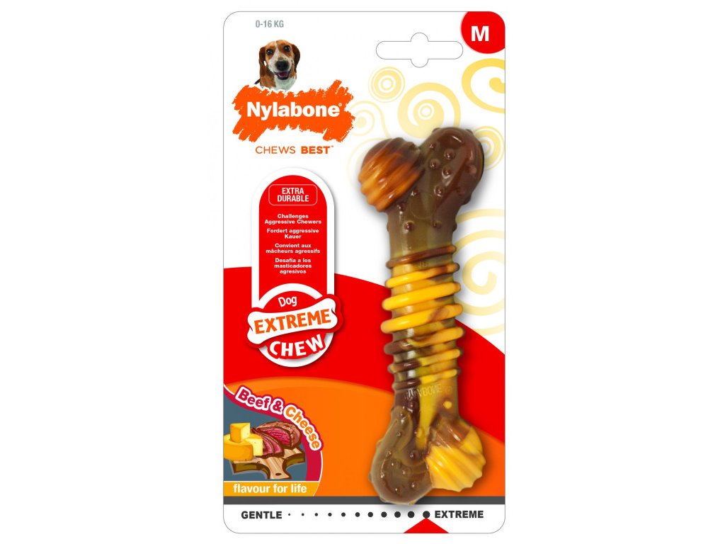 Extreme Chew jsou navrženy pro psy se silným skusem. Hrbolky pomáhají čistit zuby a redukují tvorbu plaku a zubního kamene během žvýkání. Řeší problém s agresivním kousáním. Uspokojuje přirozenou potřebu žvýkání. Příchuť hovězího se sýrem