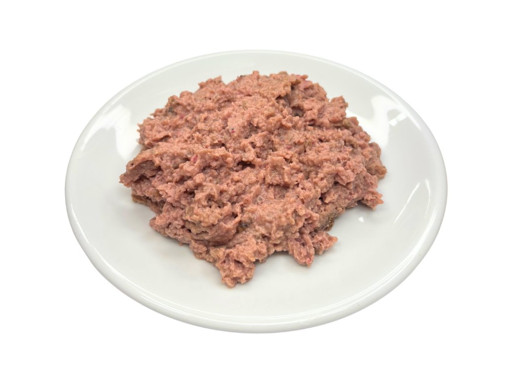 Složení: krůtí maso 35 %, kachní maso 30 %, vepřová játra 5 %, hruška 5 %, rýže, hrachová vláknina, lněné semínko