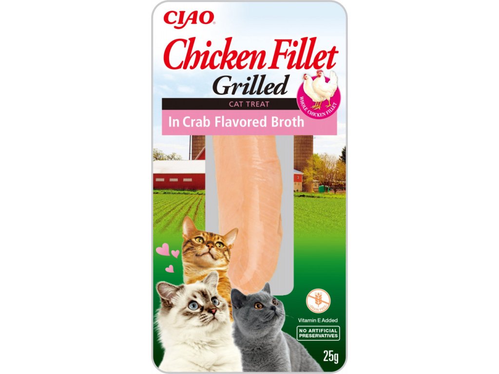 100% kuřecí filátko v poctivém vývaru z krabího masa. Šťavnatý grilovaný filet z farmářského kuřete pro gurmánský zážitek. Neodolatelná chuť a vůně poctivého masa. Křehké filátko potěší vaší kočičku jako pamlsek nebo jako doplněk běžné krmné dávky. Lahodný vývar skvěle ochutí jakékoliv granule a pomůže zvýšit chuť k jídlu. Nízký obsah kalorií. Bez obilovin, bez obsahu umělých barviv, bez chemických dochucovadel a bez aromat. Kočičí grain free pochoutka Chicken Fillet je navíc obohacena o 100% přírodní extrakt ze zeleného čaje.