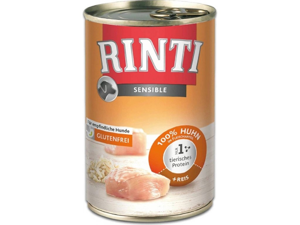 Konzerva pro dospělé psy Rinti Sensible z chutného kuřecího masa je vhodná pro alergické psy, jelikož obsahuje rýži, která je zdraví přívětivá. Masová konzerva pro psy je velmi praktická (ideální krmivo nejen na cesty).