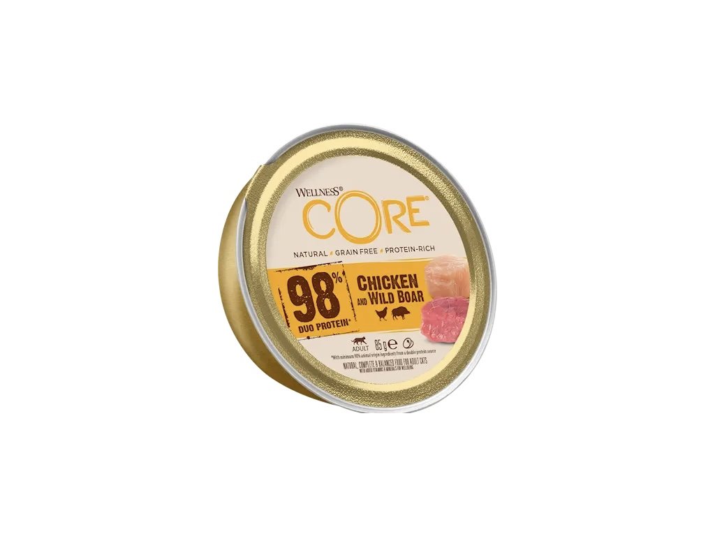 Wellness CORE 98% je přírodní, inovativní a zdravé mokré krmivo bez obilovin v podobě chutné paštiky pro dospělé kočky. Receptury jsou založeny na volbě kvalitních ingrediencí, které vaší kočce zaručí vysoký obsah bílkovin a potřebné vitaminy. Kompletní krmivo v praktických konzervách vám zaručí pohodlnou manipulaci, ideální dávkování a především kvalitní obsah. Bílkovinnou složkou je kuřecí maso a divočák. Wellness Core 98% najdete také v příchutích hovězí, krůtí, kuřecí/losos.