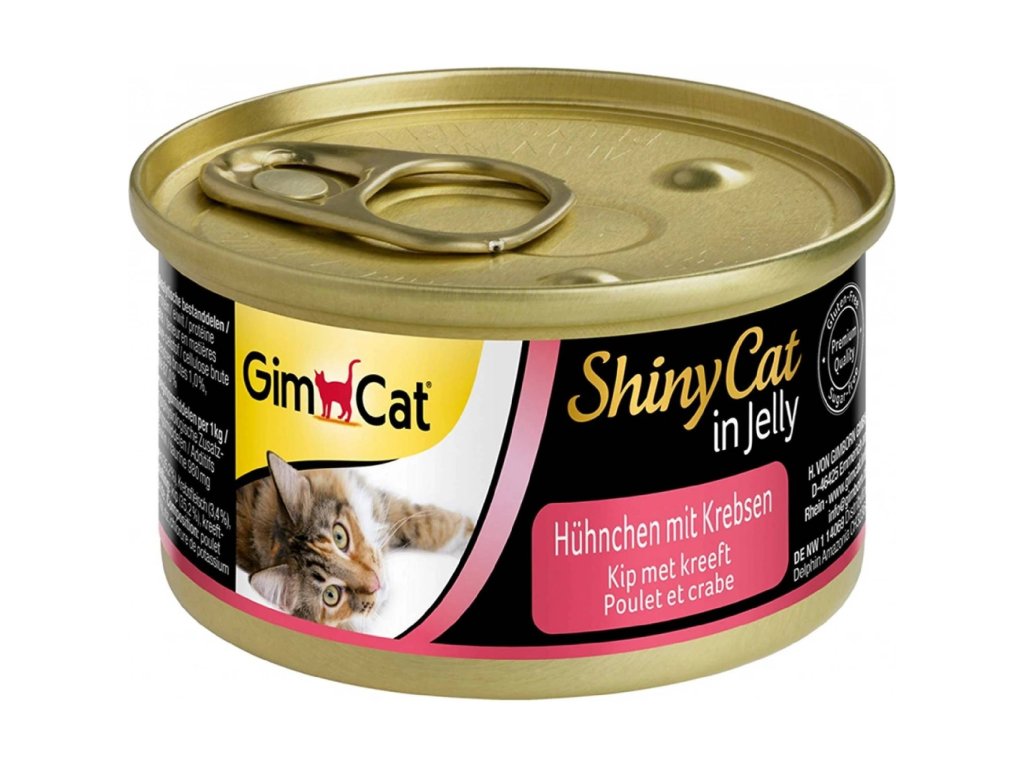 Vlhké konzervované krmivo GimPet ShinyCat s kuřetem a krabem je přírodní masová konzerva obsahuje spoustu vitamínů a potřebných život pro dlouhý spokojený život ve zdraví. Konzervy pro kočky podávejte vždy s dostatečným množstvím čerstvé pitné vody!