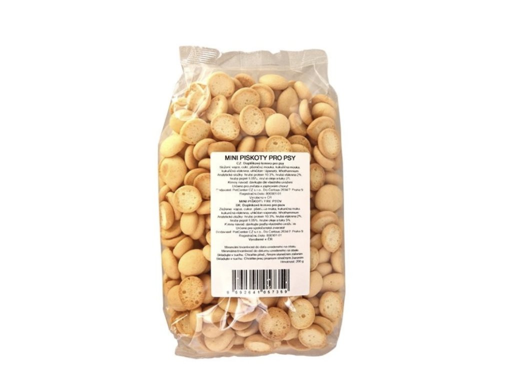 Piškoty jsou oblíbeným psím pamlskem, ovšem ty klasické mají vysoký obsah cukrů a lepku, a tak by je pejsci neměli jíst často. Piškoty pro psy mají snížený obsah lepku a cukrů a v této verzi i mini velikost, která je zvlášť vhodná pro menší plemena psů nebo třeba při výcviku vašeho mazlíčka, kdy mu potřebujete dávat velké množství pamlsků. Piškoty jsou navíc obohaceny o celou řadu vitaminů a minerálů.