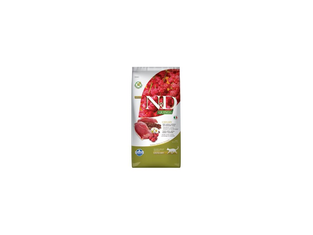 Farmina N&D Quinoa Urinary je krmivo pro zvláštní účely výživy určené k podpoře omezení opakované tvorby struvitových kamenů a onemocnění dolního močového ústrojí koček.