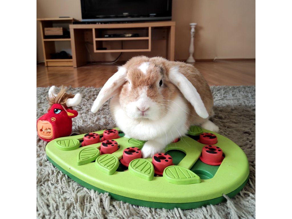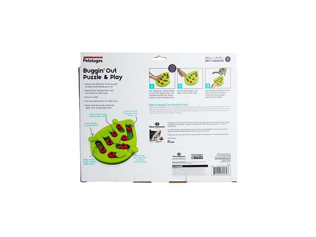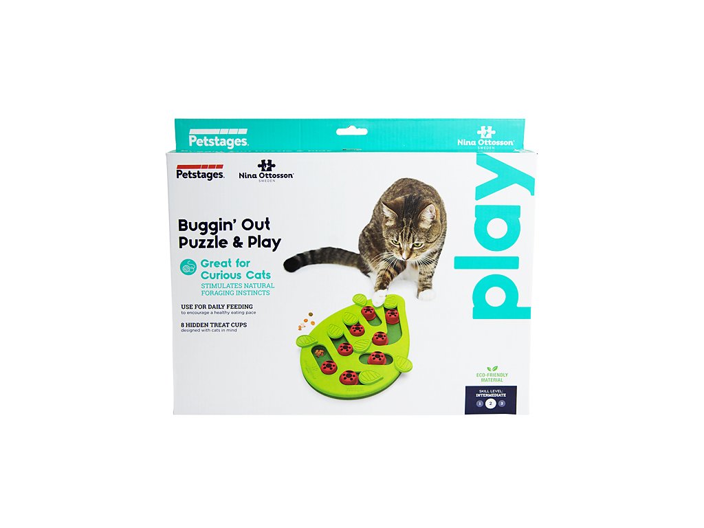 Ukryjte pamlsky nebo oblíbené granulky pod zelené lístečky nebo pod beruškové kolíčky (pamlsek vhoďte dovnitř ovorem) a připravte své kočce dlouhotrvající zábavu. Pamlsky lze jednoduše získat posunutím lístečku, složitější hru pak nabízí beruškové kolíčky, které je třeba posunout na místo lístečku, pamlsek se dostane do prohlubně. Když kočka odsune kolíček drážkou zpět, získá svou mlsnou odměnu.
