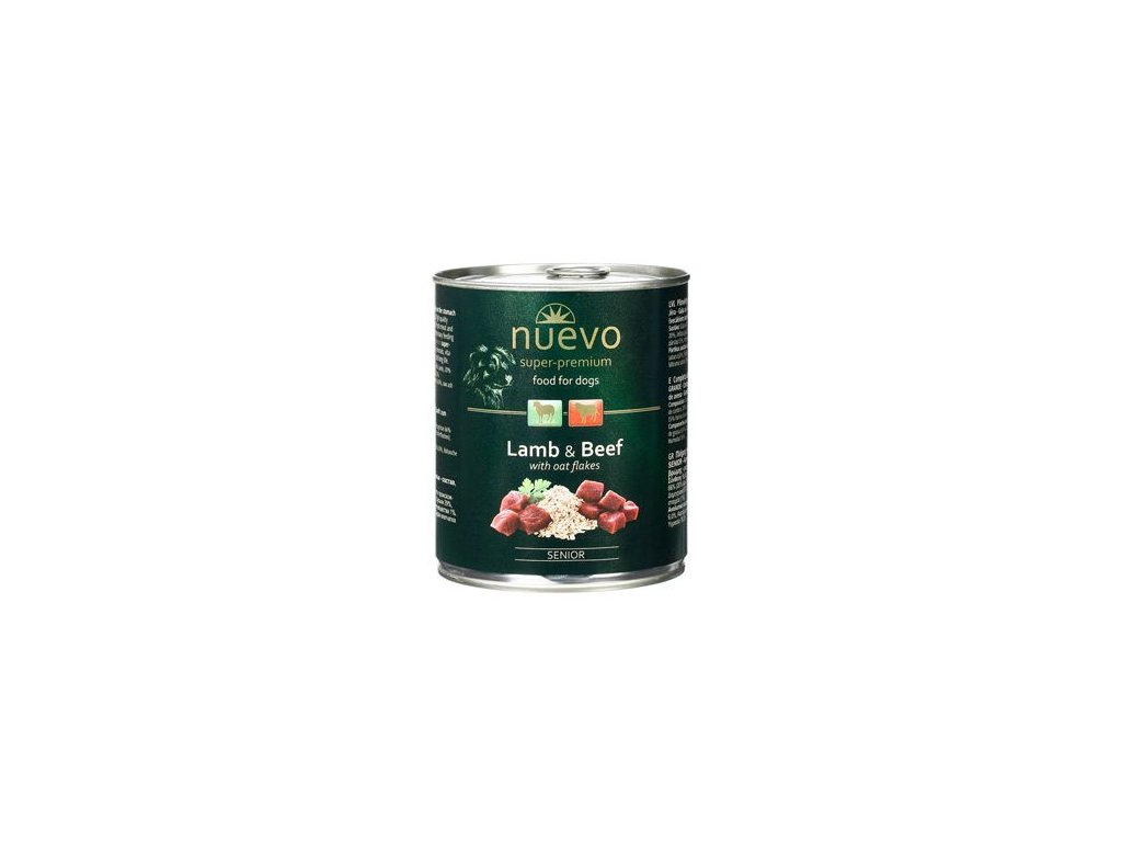 Superprémiová masová konzerva Nuevo pro starší psy Senior Jehněčí s ovesnými vločkami. Vyvážená komplexní výživa pro všechna plemena. Konzerva Nuevo SENIOR superpremiumové krmivo nabízí správný poměr bílkovin, tuků, karbohydrátů, minerálů a vitamínů splňující nutriční požadavky starších psů. Jehněčí a hovězí maso nejvyšší kvality s ovesnými vločkami šetří žaludek vašeho psa a podporují jeho dlouhý a zdravý život. Krmivo je vyvinuto pod přísnou veterinární kontrolou.