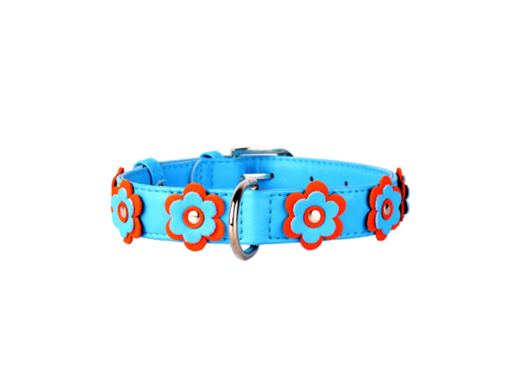 Obojek kožený Glamour Flower - modrý (30-39cm/20mm)