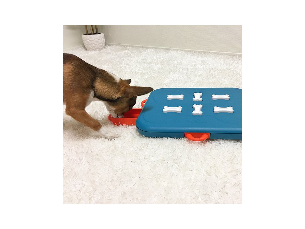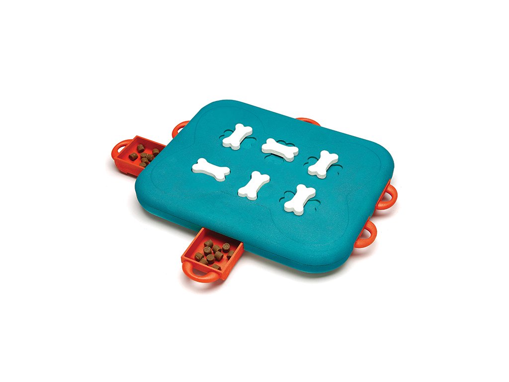 Otočte kostičky do pozice “odemčeno”, otevřete šuplíčky a schovejte do nich pamlsky nebo granule. Zasuňte šuplíčky do hlavolamu a kostmi zamkněte. Připraveno, hledání může začít! Položte hlavolam na podlahu a povzbuďte pejska k pátrání po dobrotách. Chvalením ve správný okamžik, když udělá něco správně, mu napovíte a podpoříte v dalším zápalu do hry., Pokud je váš mazlíček začátečník, nechte všechny kosti v pozici “odemčeno” a pár šuplíčků otevřených, aby věděl, jak lákavá odměna na něj čeká ve zbytku hlavolamu.