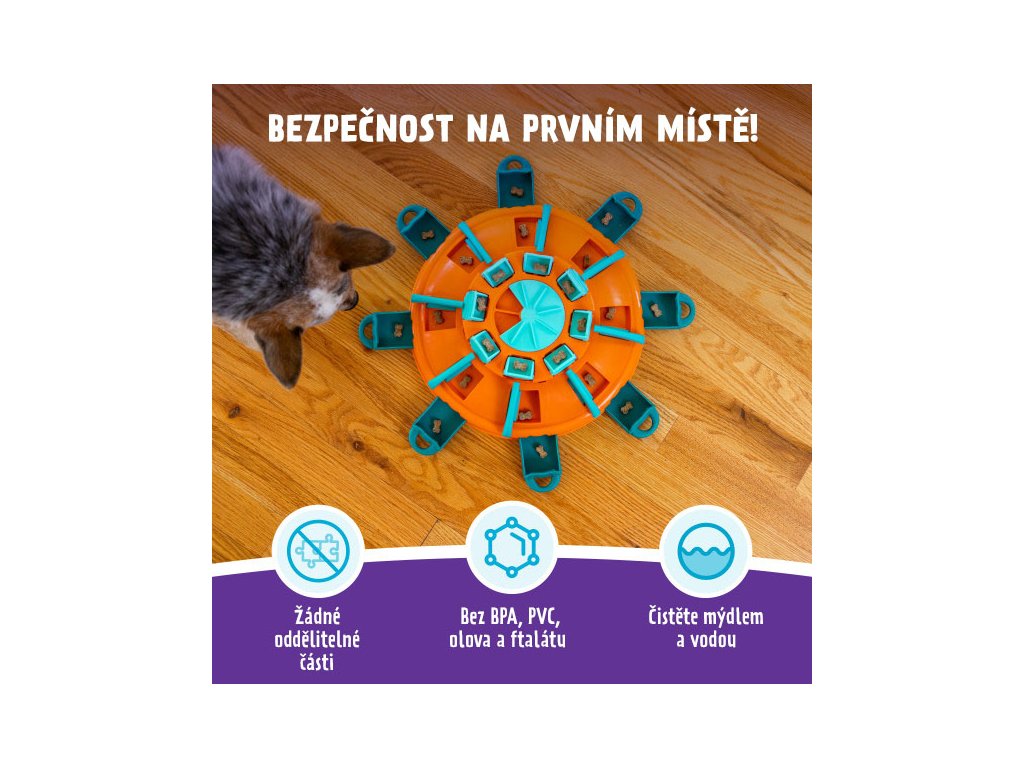 Hlavolam nemá žádné odstranitelné části, takže pes jednotlivé prvky během hry pouze posouvá nebo překlápí. Odolný materiál a provedení hlavolamu zaručuje, že tohle bude hra, ke které se budete se svým pejskem rádi vracet.