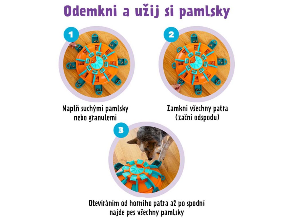 1) Začněte tak, že nejprve necháte všechny vrstvy otevřené. Vrchní středový kruh naplňte pamlsky a otočením je zakryjte. Klapky vedle kruhu otevřete tak, aby nahoře udělaly prostor pro vložení pamlsku. Posuvné schovky ve střední vrstvě otevřete a naplňte pamlsky. Stejně tak otevřete šuplíčky v dolní části věže. Nechte pejska pamlsky získat.