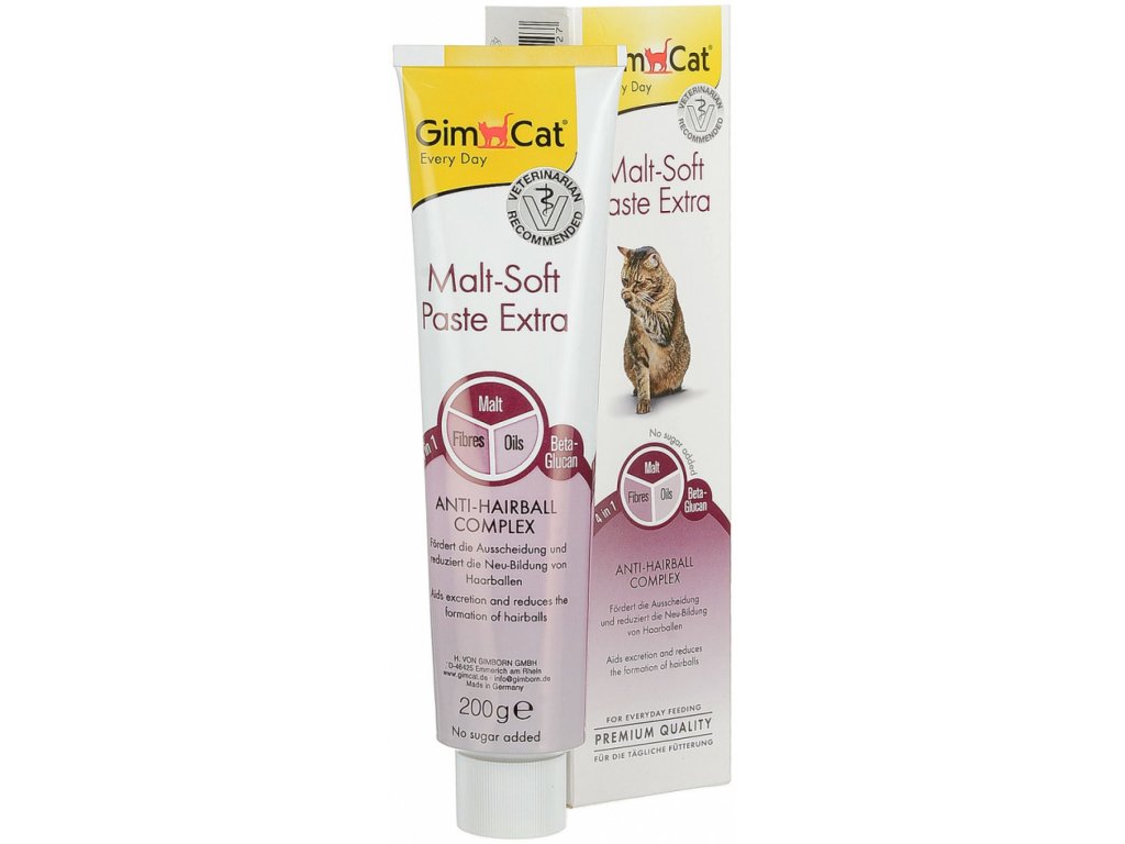 Pasta GimCat Malt-Soft Extra obsahuje jedinečný Anti-Hairball Komplex, který působí hned dvojnásobně. Kombinace výtažku sladu, kvalitních olejů a balastních látek podporuje přirozené vylučování spolykaných chlupů a pomáhá omezovat tvorbu chomáčů. Kromě toho pomáhá předcházet trávícím problémům v souvislosti s tvorbou chomáčů chlupů a betaglukan pomáhá předcházet zánětům v trávící soustavě.
