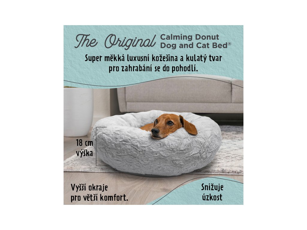 Original Calming Donut je pelíšek snů! Zatočit se do klubíčka a spokojeně spát klidně celý den. Měkký plyšový pelíšek Original Calming Donut nabízí vašim čtyřnohým miláčkům pocit ochrany a maximálního pohodlí. Vytváří měkké hnízdo se zvýšenými okraji, které přirozeně navozuje zklidňující pocit. Je ideální pro chladné podzimní a zimní dny pro mazlíčky, kteří rádi spí stočení do klubíčka.