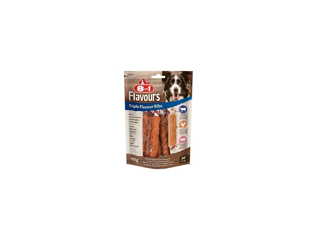 Naše neuvěřitelně lahodná žvýkací žebírka 8in1 Flavours Triple Flavour kombinují tři lahodné chutě surové vepřové a hovězí kůže zabalené v lahodně šťavnatých kuřecích prsou, které přinášejí výjimečný chuťový zážitek. Tato žvýkací žebírka, která dlouho vydrží, pomáhají díky přirozenému abrazivnímu účinku během žvýkání regulovat hromadění zubního kamene a plaku. Jsou bohatá na bílkoviny, mají nízký obsah tuku a neobsahují žádný přidaný cukr, dochucovadla ani umělé konzervační látky. Díky tomu jsou ideální odměnou nebo svačinkou, kterou si užijí psi všech velikostí. Navíc neobsahují geneticky modifikované organismy a jsou rovnoměrně vysoušené v peci. Díky tomu dlouho vydrží, ale uchovají si také cenné živiny. Dopřejte psovi spokojenou zábavu se žvýkacími žebírky 8in1 Triple Flavour.