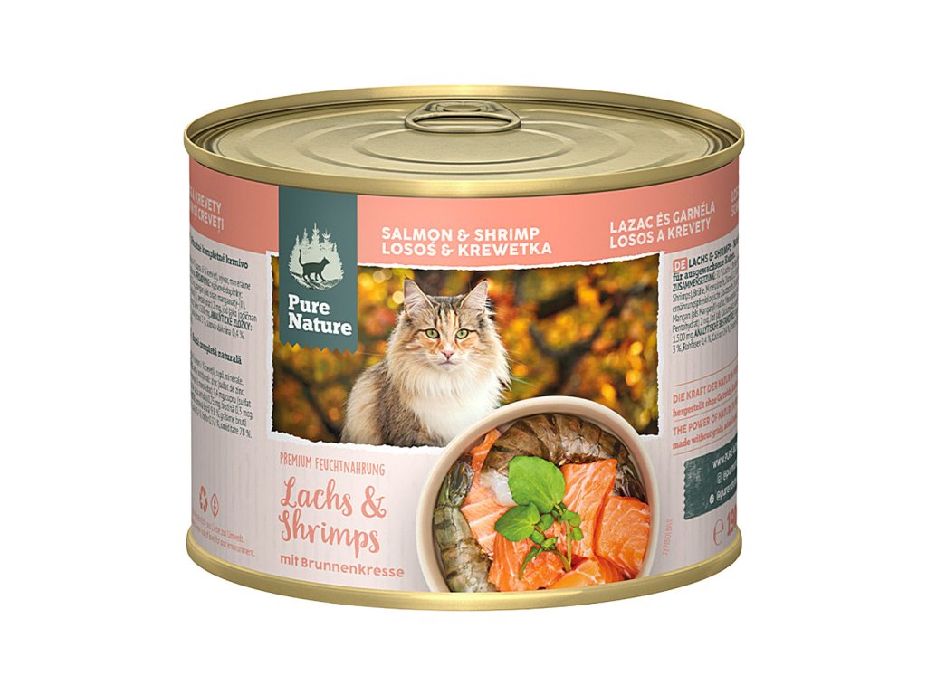 Datum minimální trvanlivosti 02/26. Vitamínová bomba pro kočky. Lososa a krevety nabité Omega-3 a minerály s blahodárnou řeřichou. Pure Nature konzerva Losos a Krevety je přírodní kompletní krmivo pro dospělé kočky. Losos a krevety tvoří perfektní kombinaci proteinů, jsou bohaté na přirozené živiny. Receptura je doplněná o řeřichu a světlicový olej.