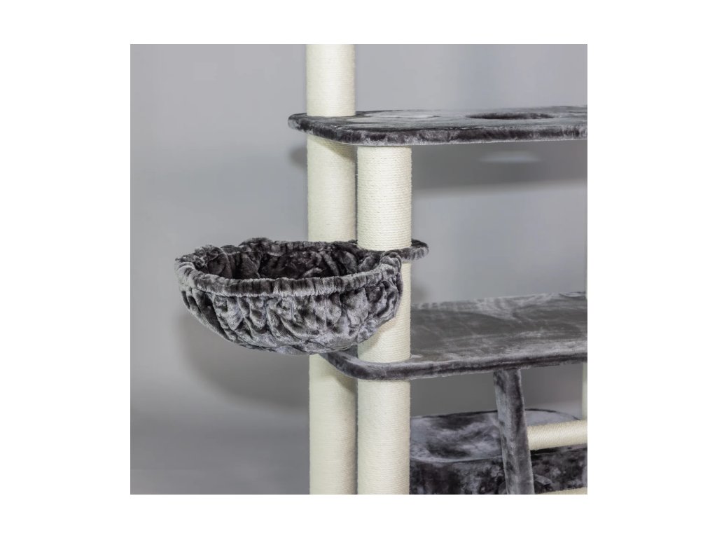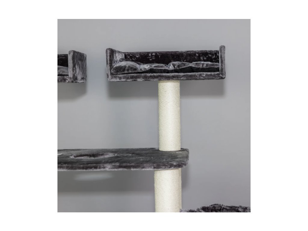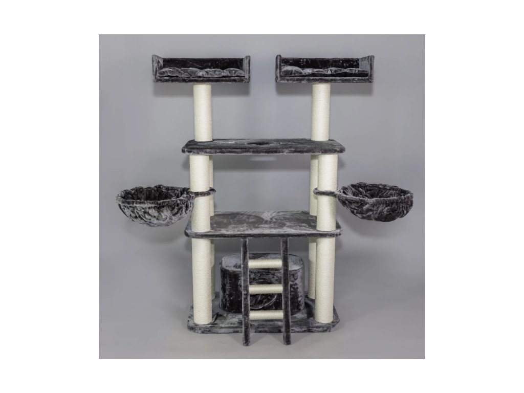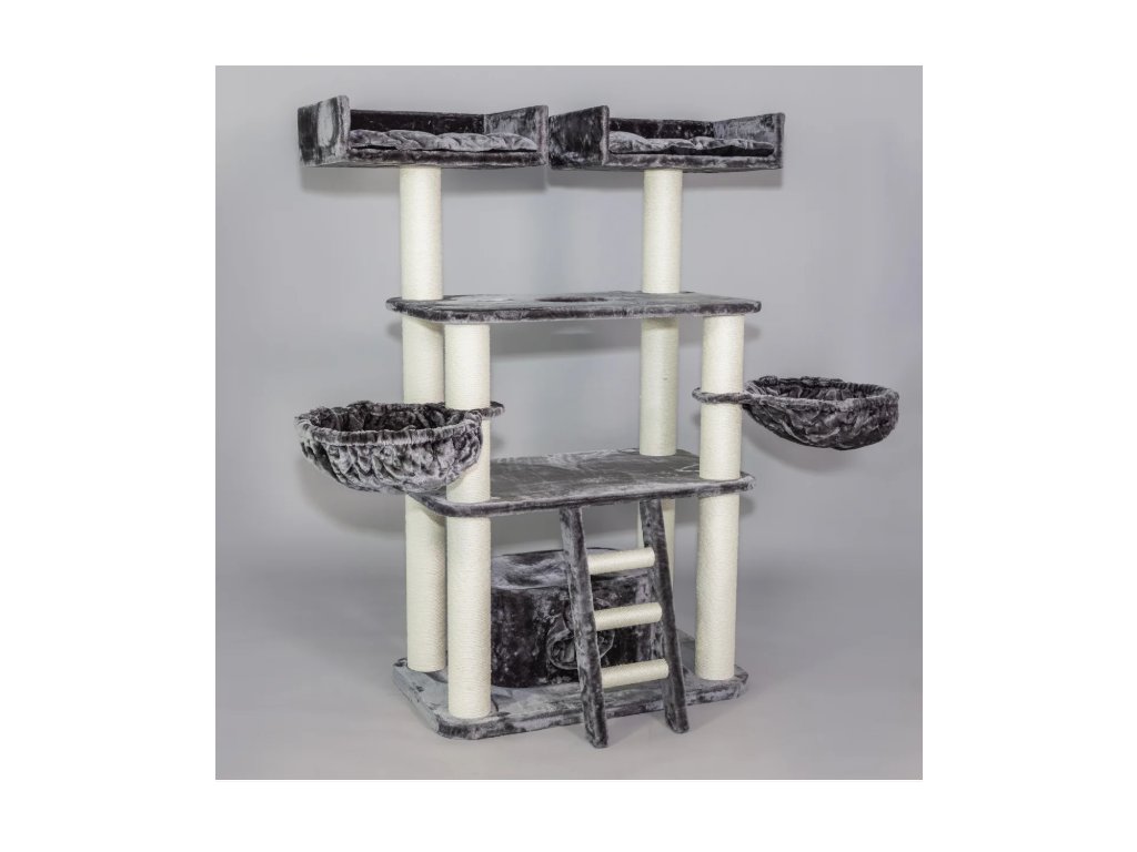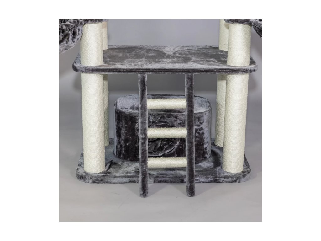 Přes produkt zdola nahoru: škrabadlo začíná silně namáhanou spodní deskou, která je nezbytná při tak velkém modelu, na kterém velké kočky běhají, skáčou, odpočívají a hrají si. Ze země (nebo po schůdcích) může vaše kočka snadno vylézt na první náhorní plošinu, kde se bez problémů dostane do mega luxusních houpacích sítí (o průměru 45 cm). Pokud to není žádoucí, tato náhorní plošina je také skvělým místem k odpočinku, protože jsme na ni položili náš plyš s gramáží 600 g / m2!
