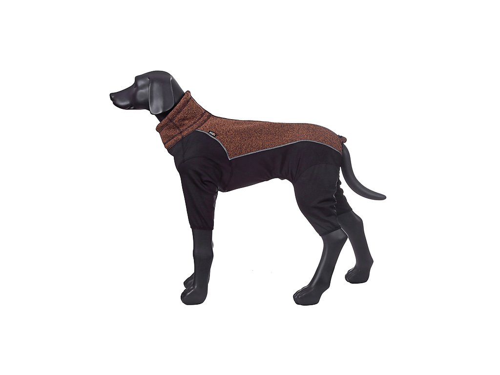Dobře padnoucí kombinéza, která udržuje psa v teple za chladného počasí, je vyrobená z kombinace technických materiálů, které jsou velmi lehké na nošení a zároveň velmi pružné, aby se plně přizpůsobili pohybu psa. Vysoký límec a záda overalu jsou z technické pleteniny, spodní část kombinézy a nohy z extrémně elastického trikotového úpletu s hladkým povrchem, ze kterého lze snadno setřít špínu a rychle schne. Oba materiály mají na vnitřní straně měkký kartáčovaný vlas, který vytváří izolační vrstvu, jsou prodyšné a zároveň hřejivé.