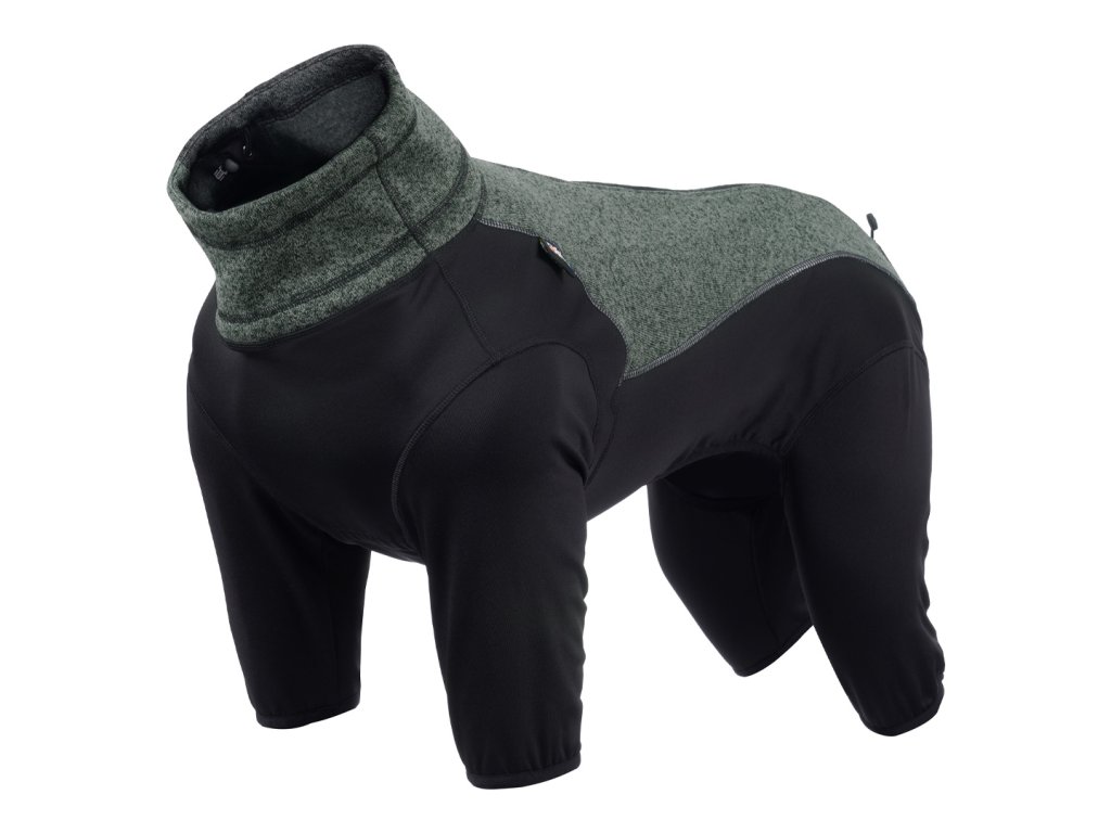 Dobře padnoucí kombinéza, která udržuje psa v teple za chladného počasí, je vyrobená z kombinace technických materiálů, které jsou velmi lehké na nošení a zároveň velmi pružné, aby se plně přizpůsobili pohybu psa. Vysoký límec a záda overalu jsou z technické pleteniny, spodní část kombinézy a nohy z extrémně elastického trikotového úpletu s hladkým povrchem, ze kterého lze snadno setřít špínu a rychle schne. Oba materiály mají na vnitřní straně měkký kartáčovaný vlas, který vytváří izolační vrstvu, jsou prodyšné a zároveň hřejivé.