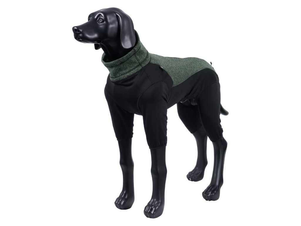 Dobře padnoucí kombinéza, která udržuje psa v teple za chladného počasí, je vyrobená z kombinace technických materiálů, které jsou velmi lehké na nošení a zároveň velmi pružné, aby se plně přizpůsobili pohybu psa. Vysoký límec a záda overalu jsou z technické pleteniny, spodní část kombinézy a nohy z extrémně elastického trikotového úpletu s hladkým povrchem, ze kterého lze snadno setřít špínu a rychle schne. Oba materiály mají na vnitřní straně měkký kartáčovaný vlas, který vytváří izolační vrstvu, jsou prodyšné a zároveň hřejivé.