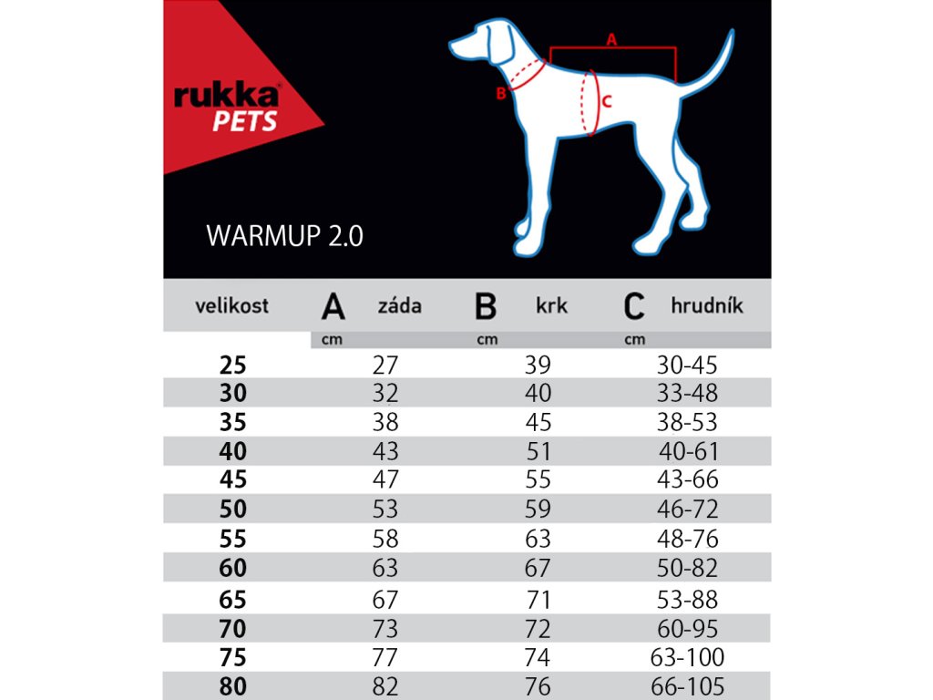 Rukka WarmUp je na špičce technologie v oblékání psů. Vnější tkanina vypadá jako běžná látka, ale má technologicky vyspělé funkční vlastnosti díky membráně. Vnitřní WarmUp vrstva má speciální izolační vlastnosti a svým zpracováním vrstev dělá vzduchovou izolaci. Proto je obleček tak lehký, měkký a poddajný, a přesto tak teplý a vysoce voděodolný.