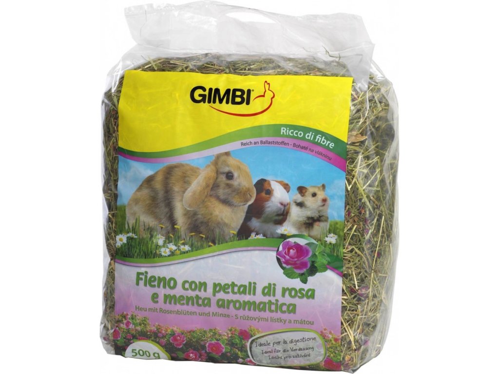 Seno Gimbi Hay s růží a mátou je kvalitním krmivem pro různé hlodavce. Ve výrobku jsou zachovány veškeré živiny a vitamíny. Krmivo pro hlodavce ve formě sena s příchutí se hodí např. pro králíky, morčata a činčily. Má nízký obsah bílkovin a naopak vysoký podíl vlákniny. Jeho požívání zabraňuje obezitě a podporuje správné fungování gastrointestinálního traktu. Seno je vhodné ke každodennímu podávání. Seno přirozeným způsobem obrušuje zuby hlodavce a stimuluje žvýkání.