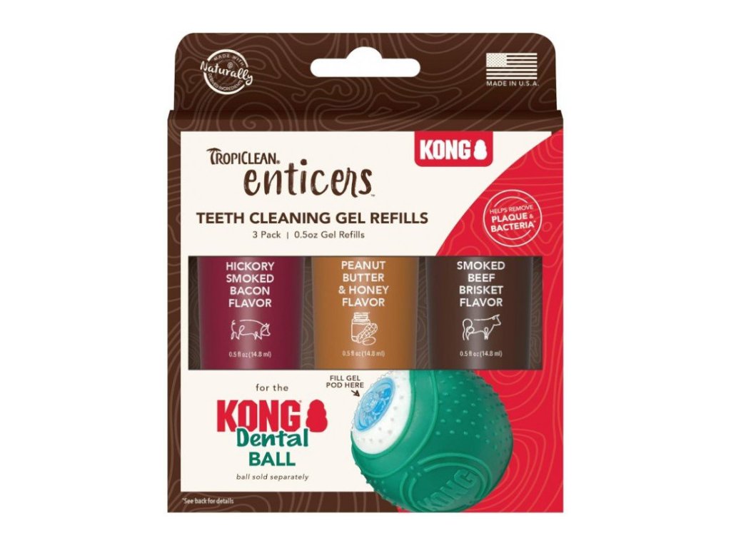 TropiClean Enticers Teeth Cleaning Gel Refill Pack pro KONG Dental Ball obsahuje tři lahodné příchutě, které můžete vyzkoušet se svým KONG Dental Ball.