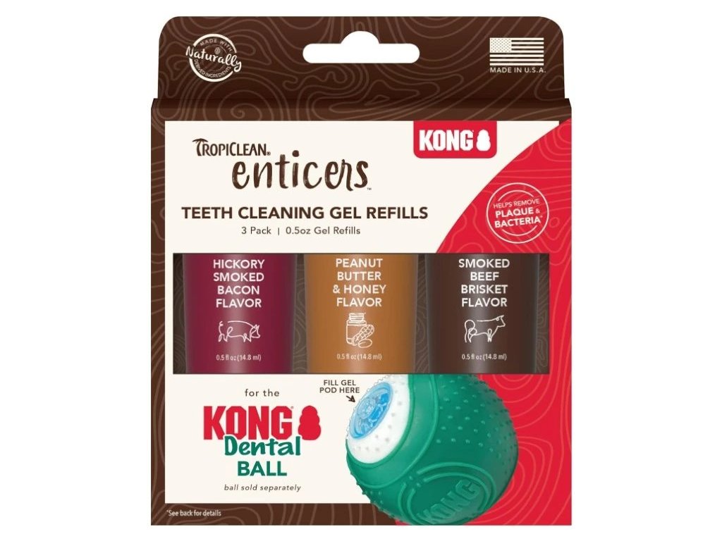 TropiClean Enticers Teeth Cleaning Gel Refill Pack pro KONG Dental Ball obsahuje tři lahodné příchutě, které můžete vyzkoušet se svým KONG Dental Ball.
