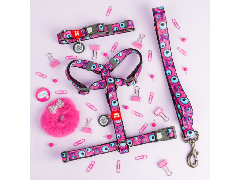 Modré oči růžové příšerky zírají z tvého nového obojku. Věř, že tohle nikdo nepřehlédne! V sadě s vodítkem plným modrých kukadel budeš vynikat, ať jsi psí holka nebo kluk. Páníčka bude navíc bavit spona se svítícím zámkem a chytrá QR známka zdarma!