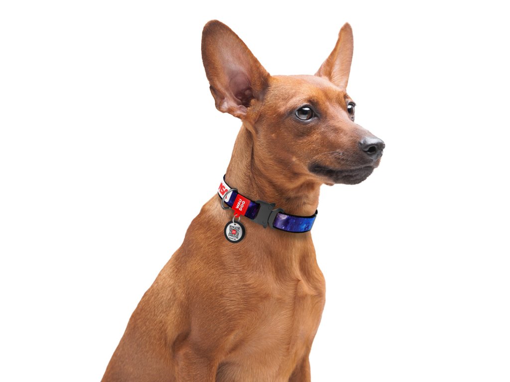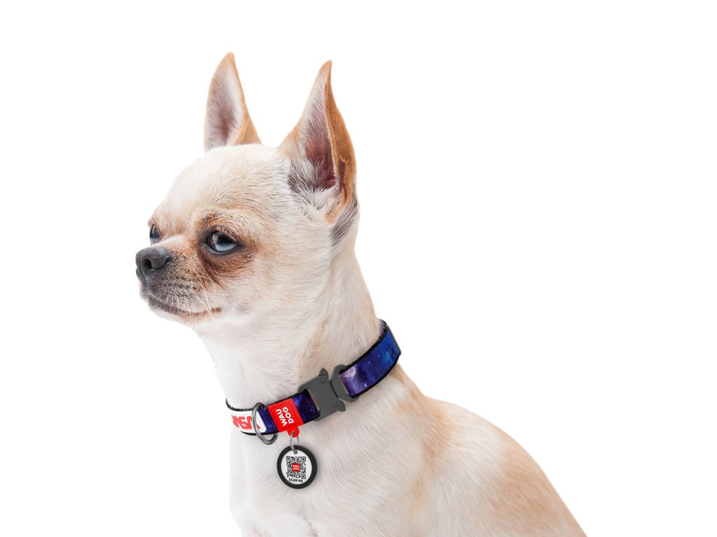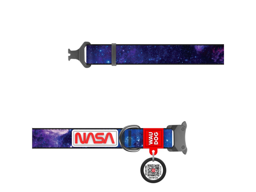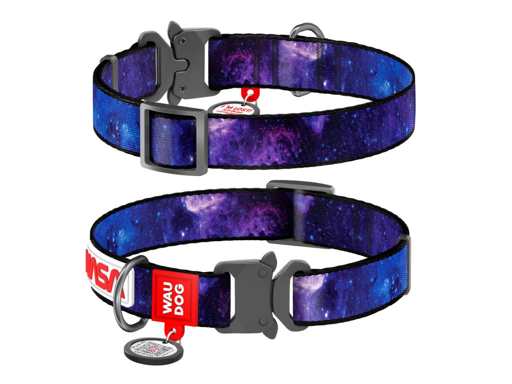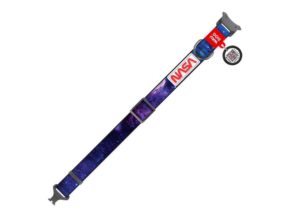 Vzor NASA21 je noční obloha plná hvězd. Titanová spona Fastex a QR chytrá známka dělá z tohoto obojku hvězdu naší kolekce Waudog.