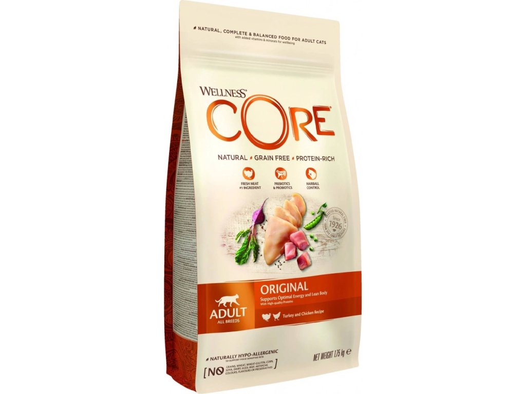 Štíhlou linii a velkou dávku energie si udrží každá kočka díky vysoce kvalitním bílkovinám, které obsahují superprémiové granule Wellness CORE Adult Original. Tato receptura je bohatá na živiny, které kočkám zajišťují pevné zdraví a dlouhověkost. Obsahuje pouze vysoce kvalitní bílkovinné přísady. Jedná se o přírodní, kompletní a vyváženou recepturu spolu s jedinečnou směsí zdravých zelenin, superpotravin a doplňků výživy. Díky vysokému množství vlákniny, podporuje snižování tvorby trichobezoárů.