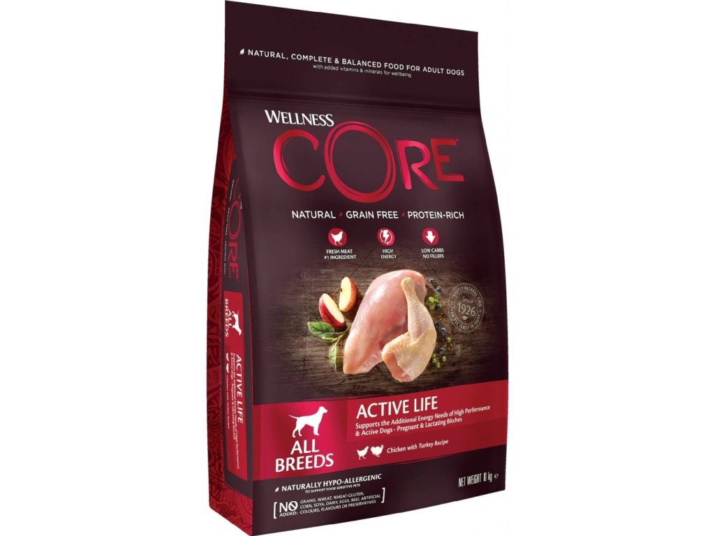 Krmivo je určeno pro vysoce výkonné psy, kteří tráví hodně času venku a potřebují být ve střehu a aktivní po delší dobu. Tato receptura se také doporučuje březím nebo kojícím fenám, aby zůstaly silné a co nejlépe se postaraly o svá štěňata. Všechny granule Wellness Core jsou nabité vysoce kvalitními živočišnými bílkovinami spolu s jedinečnou směsí zdravé zeleniny a superpotravin, rostlinných látek a doplňků výživy, bez plniv a obilovin. Active Life navíc podporuje jejich dodatečné energetické potřeby díky kombinaci vysoce kvalitních bílkovin a vyššímu obsahu tuku. Snadno stravitelná receptura obsahuje prebiotickou vlákninu a probiotika i glukosamin hydrochlorid a chondroitin sulfát pro podporu kyčlí a kloubů.