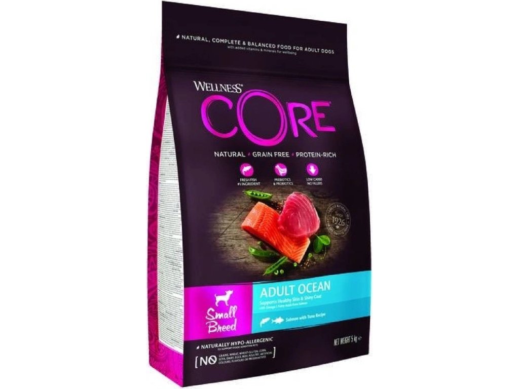 Dopřejte svému psovi zdravou pokožku a lesklou srst, a to díky superprémiovému krmivu Wellness CORE Small Breed Adult Ocean, které je bohaté na omega-3 mastné kyseliny z lososa. Granule s rybí recepturou, ve které dominuje čerstvý losos, zachutnají a podpoří nejedno citlivé psí bříško. Přírodní suroviny, nízký obsah sacharidů a žádné výplně, vysoce kvalitní masné bílkoviny spolu s jedinečnou směsí zdravé zeleniny recepturu skvěle doplňují. Probiotika podporují zdravé trávení. Menší, křupavé granule pomáhají omezovat hromadění plaku v ústní dutině. Ideální jsou pro psy, kteří potřebují jiný zdroj bílkovin, než je drůbeží maso.