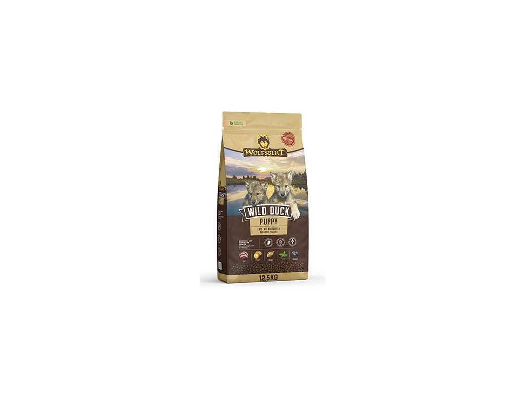 Vlci loví svou kořist od Skalistých hor Severní Ameriky, arktické tundry, hor a lesů Evropy až po pouště a stepi Střední Asie. Ty jim z obsahu žaludku kořisti poskytují maso a na živiny bohaté vnitřnosti, stejně jako zeleninu, ovoce, bobule, kořeny a bylinky. Obiloviny nejsou zahrnuty. Takto vlk získává vitamíny, minerály, stopové prvky, enzymy a druhotné rostlinné látky, které potřebuje. Protože vlk je předkem všech psů, je naše suché krmivo pro psy Wolfsblut založeno na přirozených stravovacích návycích vlka. Obsahuje dostatek masa nebo ryb v kombinaci se superpotravinami s cennými ingrediencemi – stejně jako v přírodě, bez obilovin. Náš výběr výjimečného masa a superpotravin bohatých na živiny je založen na vlčím prostředí a jeho rozmanité stravě. WOLFSBLUT nabízí každému psovi druhově vhodnou a přirozenou stravu a díky rozmanitosti odrůd si každý pes najde to své. Receptura suchého krmiva WILD DUCK PUPPY kombinuje stravu vlka s nejnovějšími vědeckými poznatky o správné výživě psů.