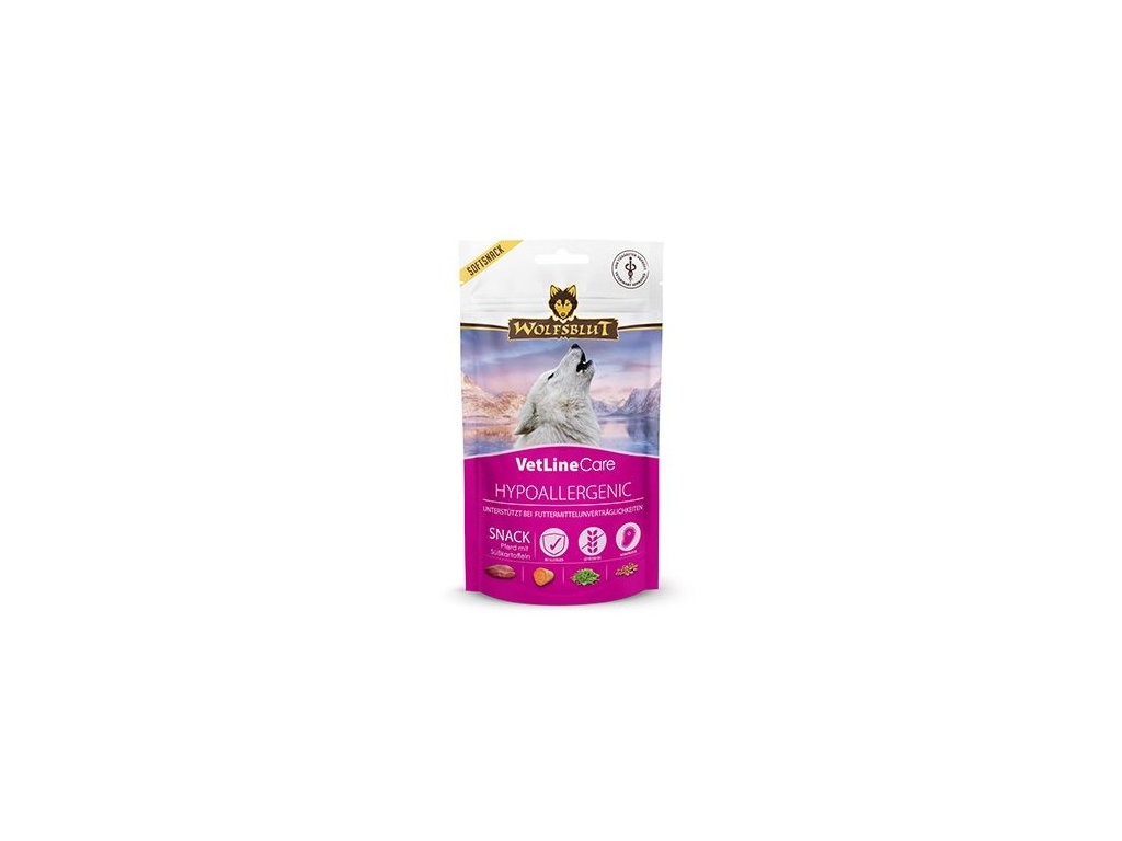 VetLine HYPOALLERGENIC Měkký hypoalergenní snack s koňským masem, lněným semínkem a řasami pro mazlíčky s intolerancemi. Jemné složení bez obilovin a zbytečných přísad šetří zažívání a potěší i mlsné jazýčky.